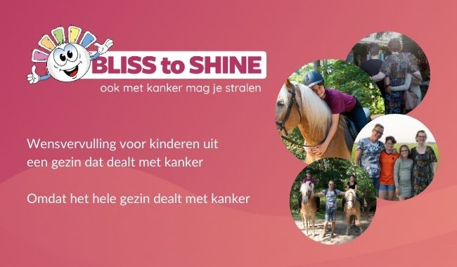Kanker heb je niet alleen. Het hele gezin heeft te maken met de ziekte en de gevolgen ervan. Deze naasten worden echter vaak vergeten. Ook zij verdienen het om in het zonnetje te staan, verwend te worden, zichzelf te kunnen zijn, de ziekte even te vergeten en nieuwe, leuke herinneringen op te bouwen. Daarom richt de stichting zich (als enige) op alle naasten van de patiënt. Tijdens de Blissi Special Day laten we een wens in vervulling gaan om gezamenlijke herinneringen voor het leven op te bouwen. Steun ons: Bliss to Shine is volledig afhankelijk van sponsoren en donateurs, iedere bijdrage is welkom. Met elkaar creëren we onbetaalbare momenten. www.blisstoshine.nl